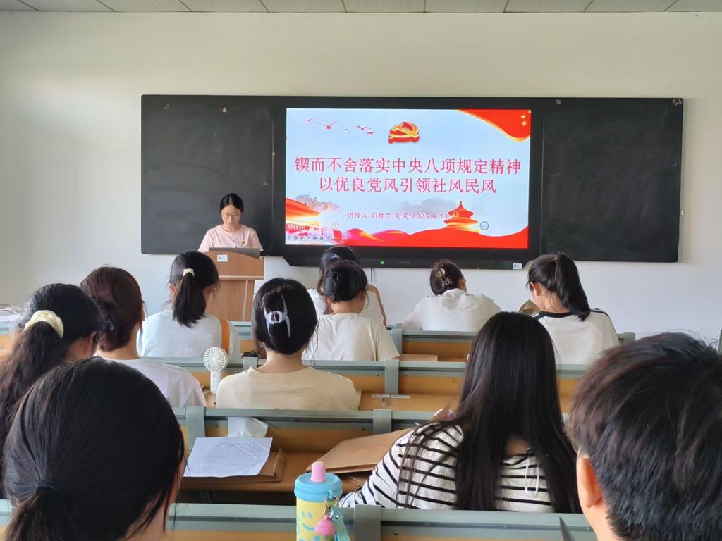 随后,全体党员集中观看党纪教育片《八项规定改变中国》。影片通过历史案例与现实成效对比,展现中央八项规定实施后党风政风的深刻变革。“这部纪录片让我从‘小切口’看到全面从严治党的大格局,作为即将踏入职场的毕业生,要牢记党纪不是空洞条文,而是我们在未来工作、学习和生活中的行动指南,指引我们在新的岗位上严守纪律规矩。”本科生工管党支部颜怡萱如是说。
