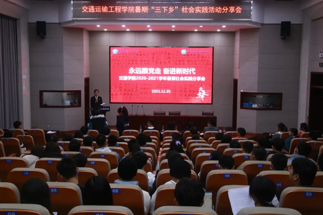 此次分享会以“永远跟党走,奋进新时代”为主题,对获得优秀暑期三下乡社会实践成果的团队进行表彰。会议开始前,交通学院学生会执行主席狄晨婷从活动准备、开展情况以及实践成果等方面对2020-2021学年暑期三下乡社会实践进行了简要的总结汇报,指出交通学院一直鼓励学生们在社会实践中了解国情、感知社情、体察民情,做到知行合一、学思悟践,在实践中提升专业素养和思想格局,并承诺在不久的将来,交通青年将勇担历史使命和时代重任,充分发扬“不抱怨 埋头干 敢担当 勇争先”的交通青年精神,不辜负党和人民的殷切期待。