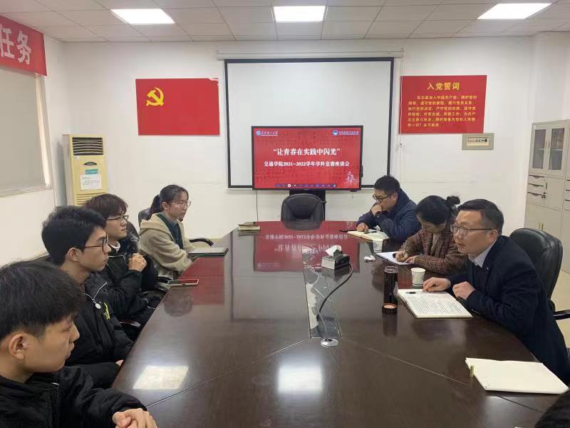 1月12日上午,交通运输工程学院于工科二号楼B-401召开2021-2022学年学科竞赛座谈会,会议主题是“让青春在实践中闪光”。本次会议由交通学院团委书记彭笠主持,交通学院党委副书记涂道勇、交通学院梁波教授以及交通学院部分学科竞赛骨干与会。