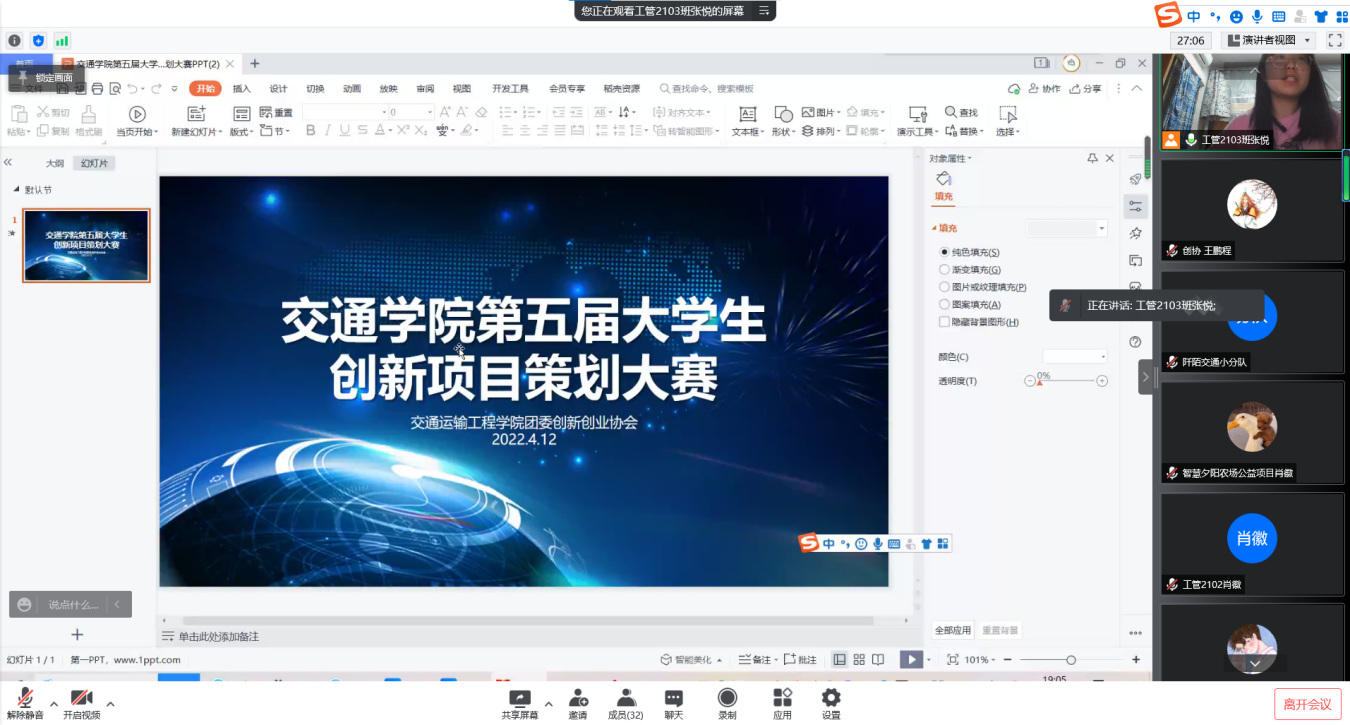 4月12日晚,交通学院于线上举办“第五届大学生创新项目策划大赛”院赛答辩。院团委创新创业协会成员张悦和刘洪利主持答辩,创新创业学院常晗老师,交通学院测绘工程系徐鹏老师,道路系葛冬冬老师,运物系邢璐老师担任评委,共计11支项目团队参加答辩。