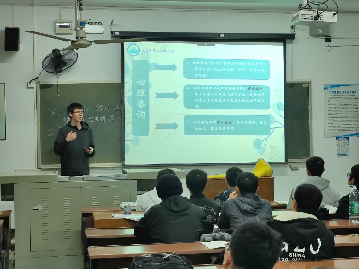 为提高学生的心理健康意识、丰富同学们的心理健康知识、帮助学生应对及处理在学习中遇到的压力及挫折,10月15日,交通学院心理学研会向21级各班进行了成长辅导室和心理咨询室的宣讲。