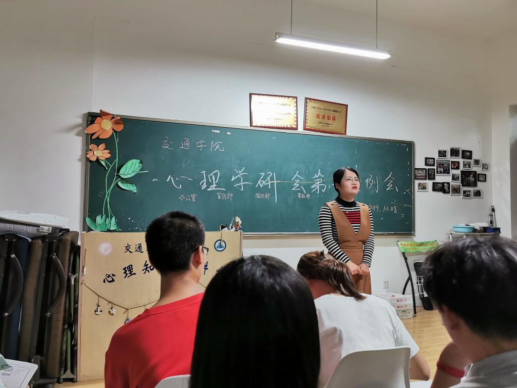 10月8日晚上,交通心理学研会于云塘工科二号楼B419室召开了第一次例会,此次会议旨在增进各部门成员的相互了解并对十月份活动进行具体安排。心理学研会辅导员汪招霞老师、学研会全体成员参加例会,会议由组织部部长唐婕主持。