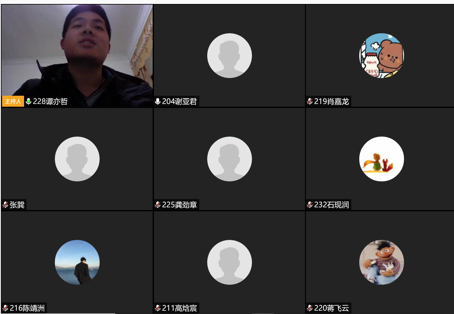 本次会议由谭亦哲同学主持,谭亦哲就本次会议主题展开思考与讨论,并且邀请各位班干部发言。体育委员龙京建就在家防疫期间的健康与运动方面与同学们展开讨论,学习委员蒋飞云还就线上学习等学习情况做出分析,并且提出几点学习要求。会议同时,下班党员裴浩阳,曾晶也对测绘1802班全体同学在学习生活上作出分享,也提出要求。还就疫情进行讨论,要求同学们积极关心疫情严重地区的同学的学习生活,充分表达了对同学们的关心与理解。