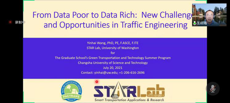 2021年7月20日上午八点半,华盛顿大学(西雅图)王印海教授应邀作了“交通工程所面临的机遇和挑战”的主题授课。本次授课由LETOU体育平台郝威教授主持。