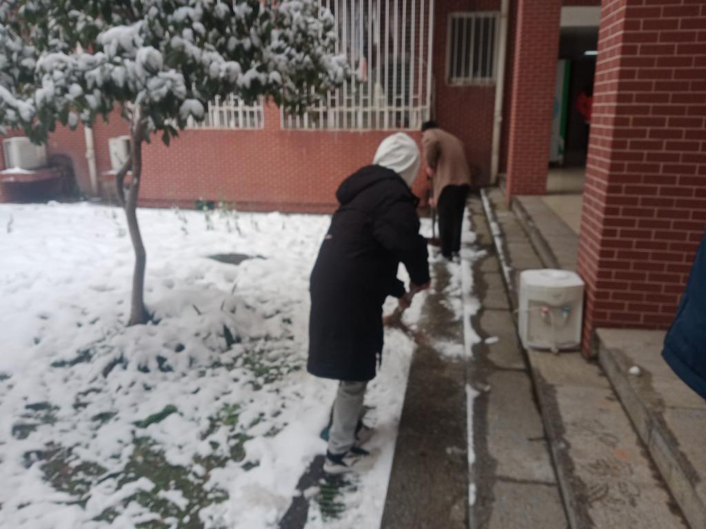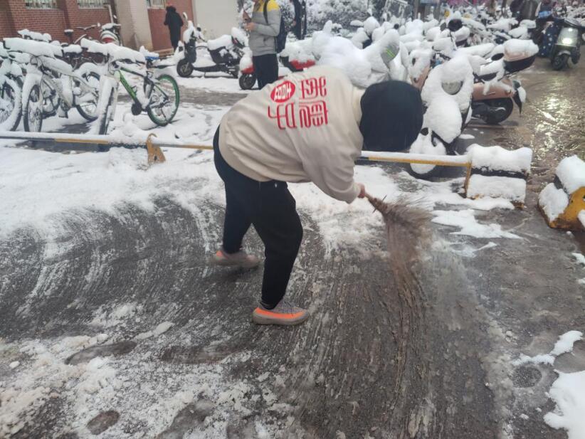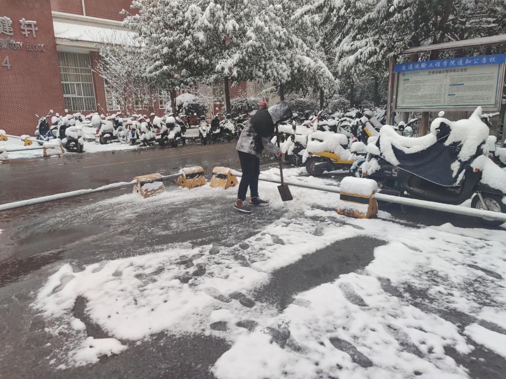 12月26日至27日,为保障师生出行安全,防止雪天地滑造成意外事故的发生,交通学院师生自发于行健轩三栋开展义务扫雪活动。由于冰雪覆盖区域较多,路面结冰湿滑,极大增加了清理难度,但同学们挥动铁锹、舞动扫帚、布设麻袋,积极投身于扫雪这场“战斗”中,配合默契。在大家的共同努力下,学生社区内的人行通道恢复了畅通、洁净,为师生安全出行创造了有利条件。