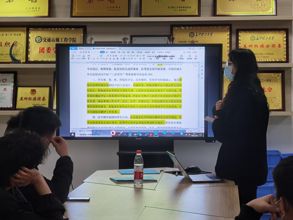 首先,徐俊向各班团支书强调了本次会议的重要性,秉承公平、公正、公开的原则,按照要求完成好各项工作。随后,组织组成员唐欣雨介绍了综合测评的具体流程,并向大家解读《交通运输工程学院本科生综合测评实施办法》,明确了各班需要提交的文件以及重要的时间节点。最后,各班团支书就综合测评工作提出相关问题,组织组成员一一耐心细致解答。