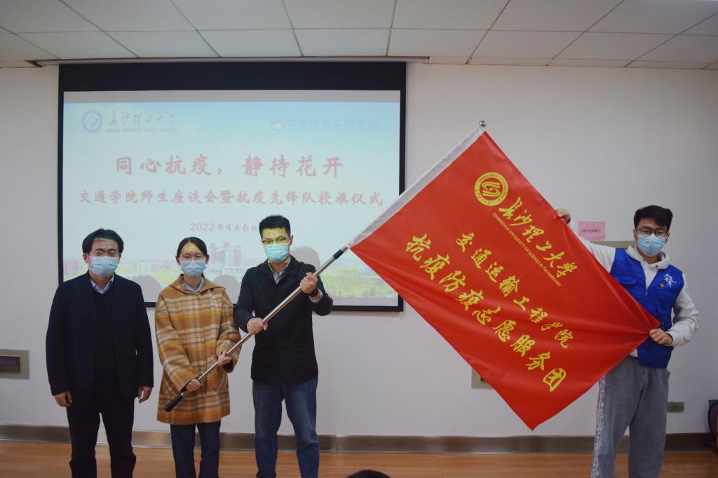钱国平为交通学院师生抗疫先锋队授旗并向大家提出了四点希望,希望同学们提高思想认识,积极配合支持学校防疫工作,做好学校学院政策的示范员、宣传员和联络员;希望大家很好地利用好校园封闭管理将学习放在第一位,将疫情防控与自身学习很好地结合起来;希望在满足疫情防控的要求下,适当开展一些文体活动,丰富大家的课余生活;希望全体同学能严格遵守学校防疫规定,每个人积极做好自己就是为学校抗疫工作做贡献。