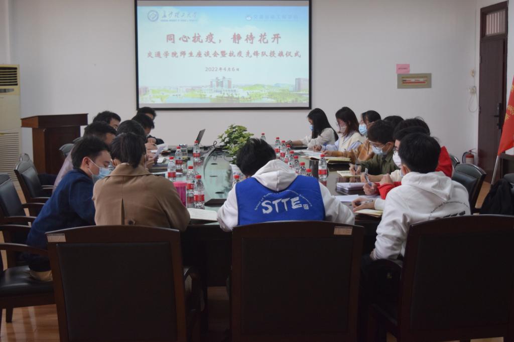 为深入了解校园封闭管理期间同学们的思想动态和防疫情况,4月6日上午,交通学院在云塘校区工科二号楼B413举行“同心抗疫、静待花开”师生座谈会暨抗疫先锋队授旗仪式。副校长钱国平、学院党委书记刘朝辉、院长张军辉、党委副书记涂道勇、副院长周访滨、学工办全体辅导员及22名本硕博学生代表参加了此次座谈。会议由涂道勇主持。