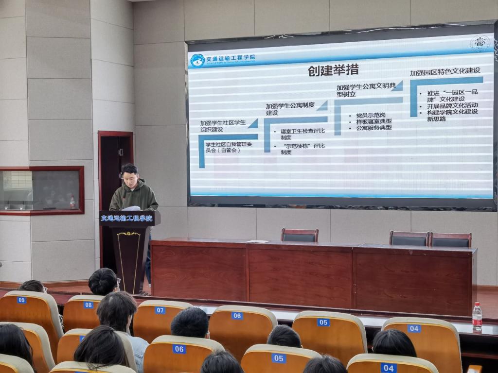 接着,曹骁对《交通学院全面开展学生养成教育“文明公寓”创建工作的实施方案》进行解读。他指出,“文明公寓”创建活动贯穿全年,以学生宿舍为依托,以学生社区重点工作、活动为载体,分为宣传发动、集中整改、创建与执行、总结与巩固四个阶段。他表示,各学生党员、学生干部、入党积极分子、班委要统一思想,高度重视,发挥榜样力量,不断总结经验,改进工作方法,促进学生素质全面提升。他还鼓励学生骨干关心帮助服务同学,主动上报并制止各种违纪、违规行为,发挥自身先锋模范作用。