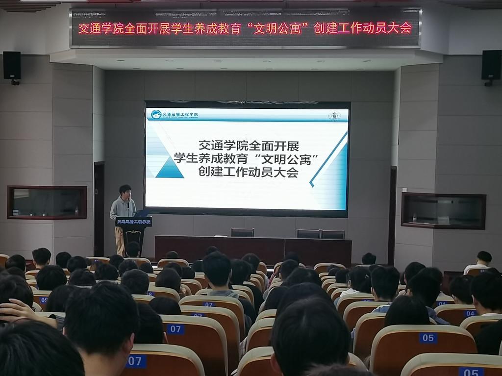 为全面落实立德树人根本任务,进一步提高学生公寓管理服务的水平,提升育人实效,5月10日中午,交通学院于工二交通科技报告厅召开全面开展学生养成教育“文明公寓”创建工作动员大会。学生社区自管会雷承卓主持会议,学工办辅导员曹骁老师出席会议,学生党员代表、第三十八期入党积极分子、各班生活委员、自管会全体成员参加会议。