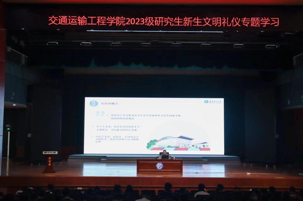 920日下午,交通运输工程学院在云塘校区大会堂开展研究生文明礼仪专题讲座,本次讲座由研究生辅导员周浩主讲,2023级全体研究生新生参加。