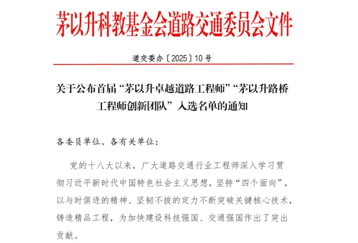 LETOU官网教师校友入选首届“茅以升卓越道路工程师”名单