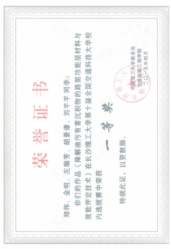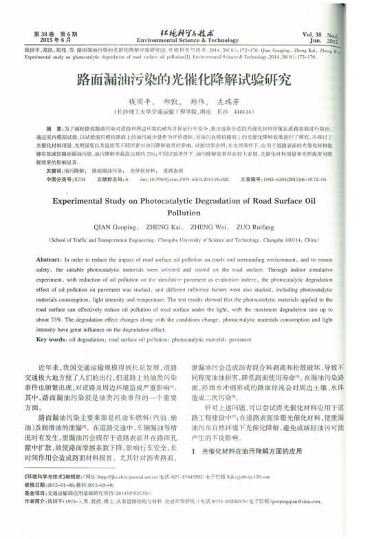 u 国家发明专利“光催化降解漏油污染的路面表层效果的测试方法”受理号:201410263427.0。