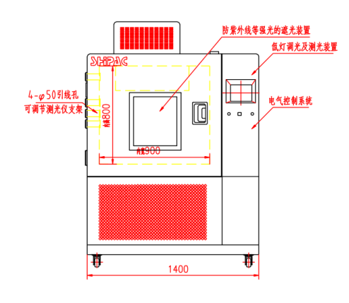 (1)氙灯(1800W~2500W)位于内箱上部,附有滤光玻璃和聚光罩。氙灯装置内尺寸为0.5m×0.9m×0.8m,聚光罩下方的可操作预留高度为0.5m。照射高度60cm-70cm及以上,照射面积350*700mm(在此面积内光照强度均匀),照射面积为中间处,光照强度20-1200W/m2连续可调。选定光照强度后,辐照度的波动不大于5%。光谱范围:0.29-0.8μm。选定辐射强度时的光照波动偏差(测光误差)在50W/m2内。测光精度1W/m2。光感应探头的位置设于距内箱底0.1m处。