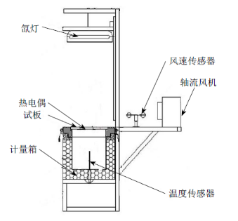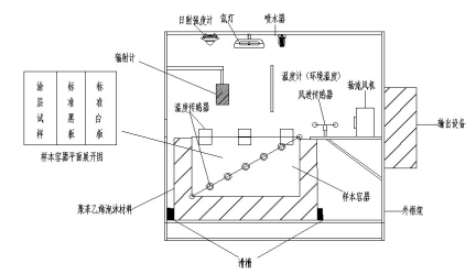 JG/T235规定了热反射涂料隔热温差的测试方法:用红外加热灯分别照射固定于测温箱开口处的空白试板和热反射涂料试板,测量试板背面温度,待达到热平衡后,空白试板和热反射涂料试板背面温度之差即是这种热反射涂料的隔热温差。刘翼等对此方法进行了改进,同时考虑到热源辐照度、环境风速、空气温度等对测试的影响,研发出隔热温差试验机[7]。