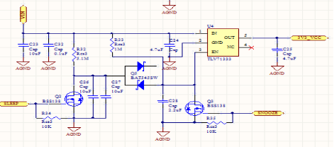 电源部分电路设计见图2-3,可以看出电路中有snooze和sleep两个控制端通过电阻电容接到主芯片上,电容电阻的阻值大小决定了定时的时长,功能相同。当芯片需断开供电时,产生一个脉冲信号,此时MOS管导通,电容储存的电荷释放,稳压芯片使能端变为低电平,稳压芯片失能,输出电压为0V,主芯片不工作,MOS管断开,电容充电,当电容两端电压达到稳压芯片使能阈值时,芯片使能,主芯片工作,检测是否还需休眠,重复上述步骤。