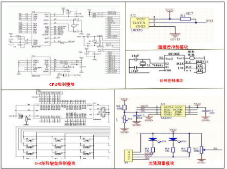 Ÿ 传输终端从监测器设备中接收到的数据打包,可以在手机APP上实时查看货物信息,同时可以传送到控制模块经过分析、处理后,通过内嵌TCP/IP协议GPRS模块接入GPRS网络,将车辆上的货物的实时信息和车况信息传送到数据中心进行对应显示、储存管理。团队已设计的监测器是以单片机STC89C51为核心的恒温箱监测器。基本模块包括:CPU控制模块、温湿度模块、时钟模块、光强测量模块、4*4矩阵键盘控制制模块、Wi-Fi模块和GPRS模块。如图8-1为监测器的实物图,图8-2为监测器的细节图。8-3为该监测器的设计电路图。