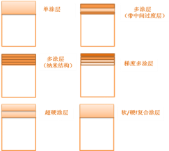 涂层材料常用的涂层材料[18]有金刚石、碳化物、氮化物、碳氮化物、氧化物、硼化物、硅化物、复合涂层等八大类数十个品种,常见的涂层刀具有金刚石涂层刀具、Al2O3涂层刀具、TiC合金刀具、TiN涂层刀具及其三种混合的TiC-Al2O3-TiN复合涂层刀具、立方氮化硼(CBN)涂层刀具等。涂层刀具的分类和结构如表5和图3所示: