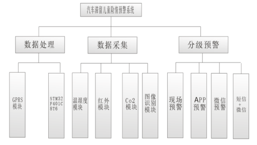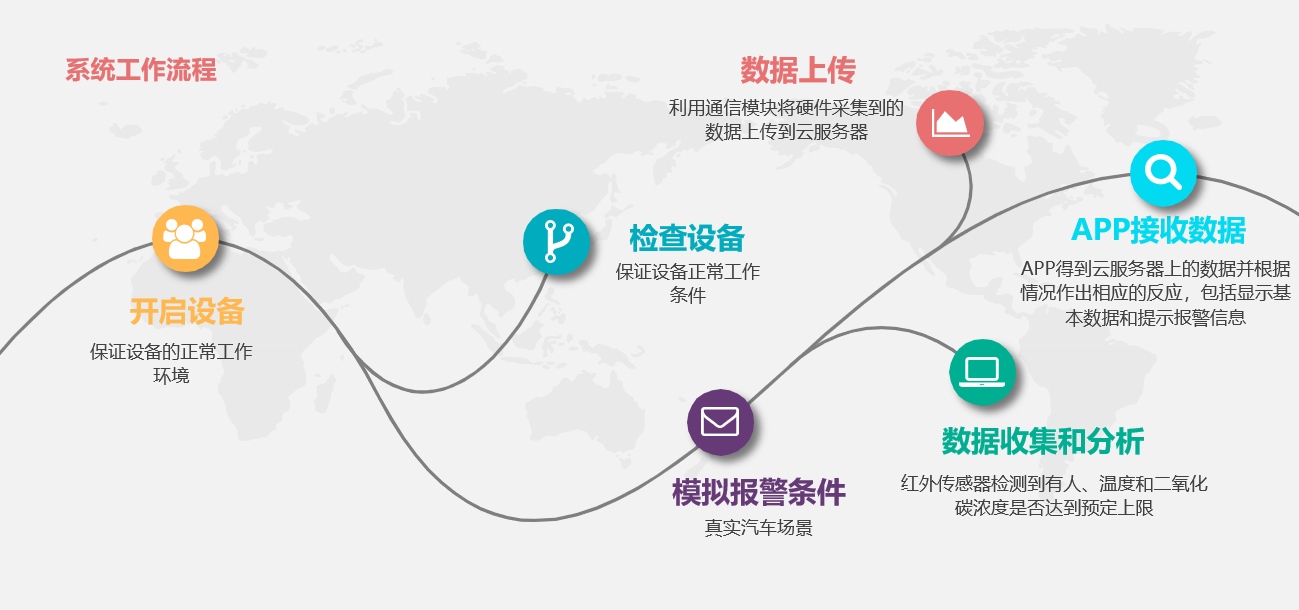 通过本系统的构建,实现汽车密闭环境下空气中二氧化碳浓度、温度、人体的状态监测,结合关键智能技术,进行意外事件可能发生的判断,针对可能出现的险情,通过APP、短信等多种方式,进行智能的预警处理,有效杜绝车内意外事件的发生。