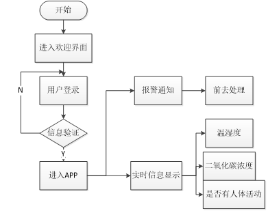 用户APP主要功能分为两个模块,分别是车内实时信息显示,报警通知。其工作流程如图下所示。当使用者打开用户APP后会显示欢迎界面,之后用户进行登录,输入账号和密码,登录成功后,便可进行信息查看。在APP中用户可查看到车内实时环境信息,若有人员在车内且车内环境状况不佳,APP则会发出报警通知。