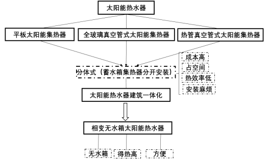 综上所述,在国内开发高效无水箱热水器新技术是面对能源转型,解决常规热水器高能耗问题以及节约能源的有效途径之一,因此,无水箱太阳能热水器的研发具有非常重要的意义。本项目拟根据我国太阳能资源特点以及居民用水特征,开发基于高效相变储热材料的无水箱太阳能热水器整体优化技术,并开展工程现场实践应用。