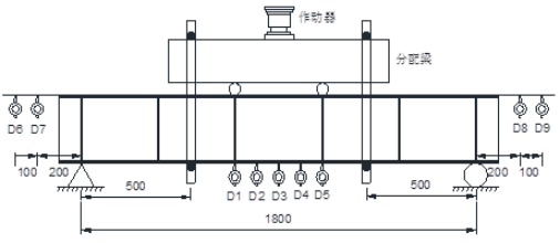 该部分试验完全在钢梁材料弹性范围内进行,对仪器精度要求很高、每一次测量和每一步操作都必须精准到位。首先用钢尺将钢梁上下翼缘板沿梁长方向进行20等分,等分距为100mm,沿宽度方向进行2等分找出对称轴,并用油性笔标出方便后续架设百分表,在跨中、集中荷载作用处、距离跨中50mm处设置5个百分表,编号D1~D5,测量钢梁同一级荷载下不同位置处的挠度,其中D2~D3除了用来测量挠度外,还可以组合起来用来测量钢梁处于弹塑性阶段的变形曲率,具体见后续介绍。这里需采用机械千斤顶加载,机械千斤顶相对于其他液压装置来说具有更好的稳定性在正式加载前必须对钢梁进行预加载,减少或消除支座位移,观察千分表运转是否正常。正式加载采用分级加载,加载上限初步设定为40kN,加载步长为每级2kN至4kN不等,每加载一级后停10—15min,待荷载稳定后进行读数,加载装置如图7所示。