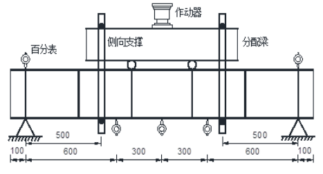 进行完抗弯刚度退化研究试验后,百分表数量可适当减少至5个,分别放置在跨中、梁跨1/3处以及两支座点处,在分别距支座位置500mm设置侧向支撑防止加载过程中出现整体失稳现象,同时在支座位置处设置夹支钳住梁端防止扭转,预加载检测仪器设备正常后进行分级加载,每加载一级中间停10—15min,待荷载稳定后进行读数,加载步长10KN到20KN不等,试验梁开始进入塑性后连续加载直至荷载不能继续增加,达到极限荷载且随后荷载出现显著下降后停止加载,观察最终的破坏形态数据要连续采集。具体加载装置如图3.2所示。