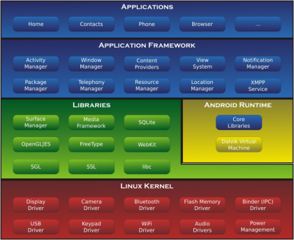 Android操作系统的核心属于Linux内核的一个分支,具有典型的Linux调度和功能[4],除此之外,Google为了能让Linux在移动设备上良好的运行,对其进行了修改和扩充。如图4所示,Android的系统架构大致分为了四层,分别为Linux内核层、库和进行时、框架层和应用层。Android的体系架构是鼓励系统组件重用,共享组件之间的数据,并定义组件间的访问权限控制。可以说,这些层次结构相互独立,又互相关联[5]。