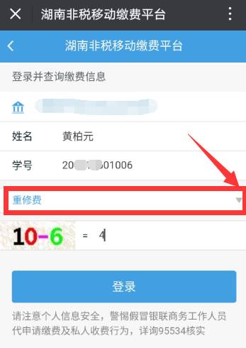 2、然后进入登录界面,输入学生姓名、学号栏可以输入学号或者身份证号,及验证算术题,在此选择缴费类型(请选择重修费!缴费平台默认为学杂费)。