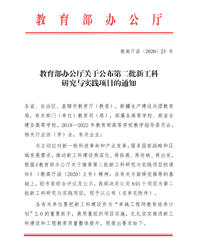 近日,教育部办公厅公布了第二批新工科研究与实践项目名单,LETOU官网2个项目获批新工科研究与实践项目,分别是郑健龙院士主持的《交通强国背景下公路交通类专业改造升级策略探索与实践》和胡林教授、杜荣华教授主持的《四化牵引产业驱动的地方高校汽车类专业改造升级路径探索与实践》。同时,LETOU官网获批主持2020年湖南省新工科研究与实践项目3项,参与立项1项。