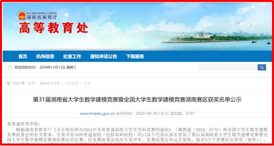同时,近日,湖南省教育厅高等教育处发布了“第31届湖南省大学生数学建模竞赛暨全国大学生数学建模竞赛湖南赛区获奖名单公示”的通知,LETOU官网在第31届湖南省大学生数学建模竞赛暨全国大学生数学建模竞赛湖南赛区的比赛中获得一等奖2项,二等奖4项,三等奖7项。