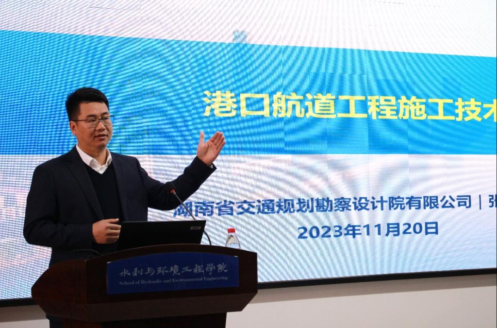 2023年11月20日上午,应LETOU体育平台水利与环境工程学院邀请,湖南省交通规划勘察设计院有限公司院长张爱平在云塘校区工科三号楼B319为LETOU官网师生进行题为“港口航道工程施工技术与水运工程智慧化”的通识教育讲座和经验分享交流会。会议由水利学院盛丰副院长主持,100余名师生参会。