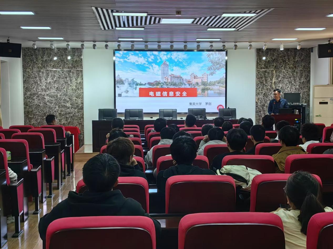 11月23日下午2:30,集美大学计算机工程学院茅剑教授应邀作为我院电子信息类专业前沿系列名师专题课的主讲人,助力学术型人才培养。茅教授在理科楼B-413为学院电子科学与技术的同学们讲授了一堂以“电磁信息安全”为主题的专题课程。前来聆听课程的师生合计100余人,学院副院长范志强出席并主持会议。