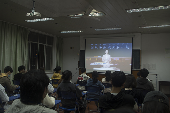 当晚,学生党员和团学干部齐聚金盆岭校区14教600教室,收看国家安全公开课“我是接班人”网络大课堂《国家安全 我们在一起》。其他学生由各班班主任组织,在教室集中收看。