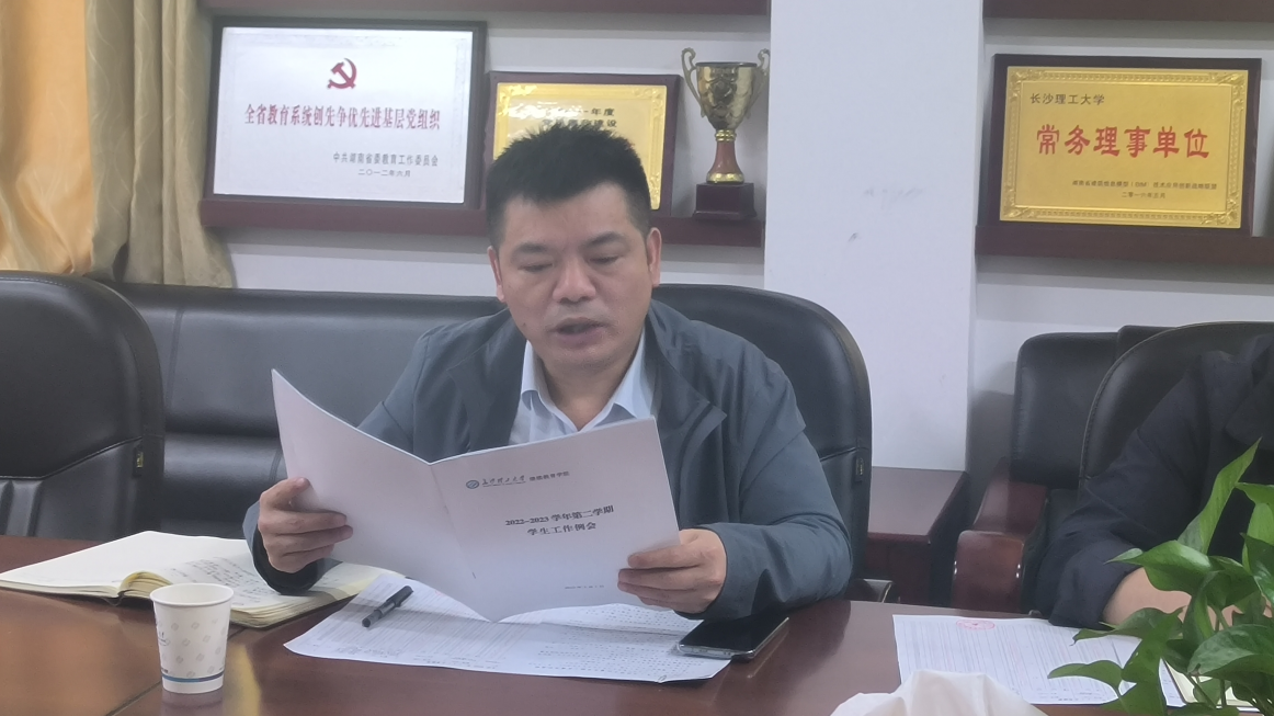学工部主任范石泉就日常管理工作、团学工作、心理健康工作、党建工作等四个方面总结了4月份学工部的工作,并对5月份的学生工作进行了安排。大家针对当前校园常态化管理中发现的问题,如消防安全教育、心理健康问题、学生外出租房、评奖评优、党建工作等进行了交流和探讨。各校企合作部对4月份学生工作进行了小结,对5月份学生工作进行了具体安排:一是做好5.25心理活动月工作;二是开展5月主题班会活动;三是做好毕业生离校寝室床位统计工作;四是加强课堂质量管理;五是针对新冠复阳情况,持续做好疫情防控学生日常管理工作。