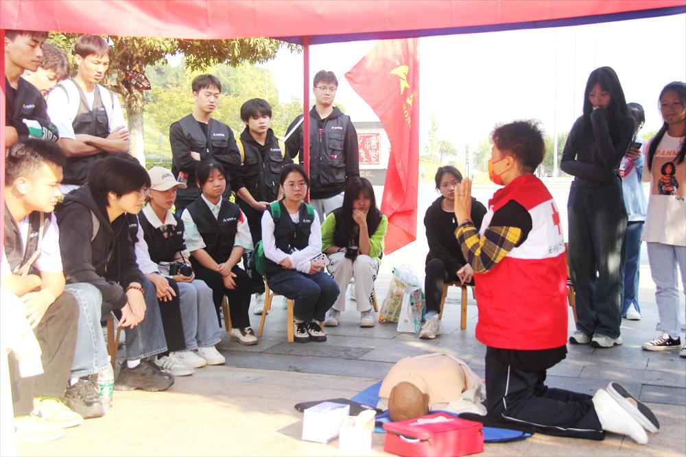 上午,在松雅湖礼乐广场,由红十字会工作人员对急救知识进行讲解、操作,虹星团支部成员进行了学习演练。