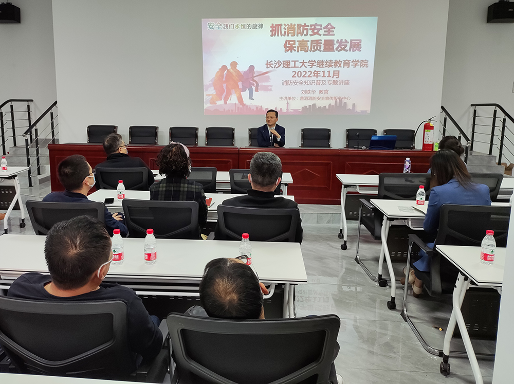为进一步普及消防知识,提高预防火灾意识、火场逃生自救能力和灭火器材的使用能力,2022年11月1日下午,继教学院在金盆岭校区14教118会议室举办了“消防安全知识讲座”。讲座由何纯芳书记主持,邀请了来自湖南省普消消防安全宣传服务中心的刘铁华教官主讲,继教学院全体教职工参加。