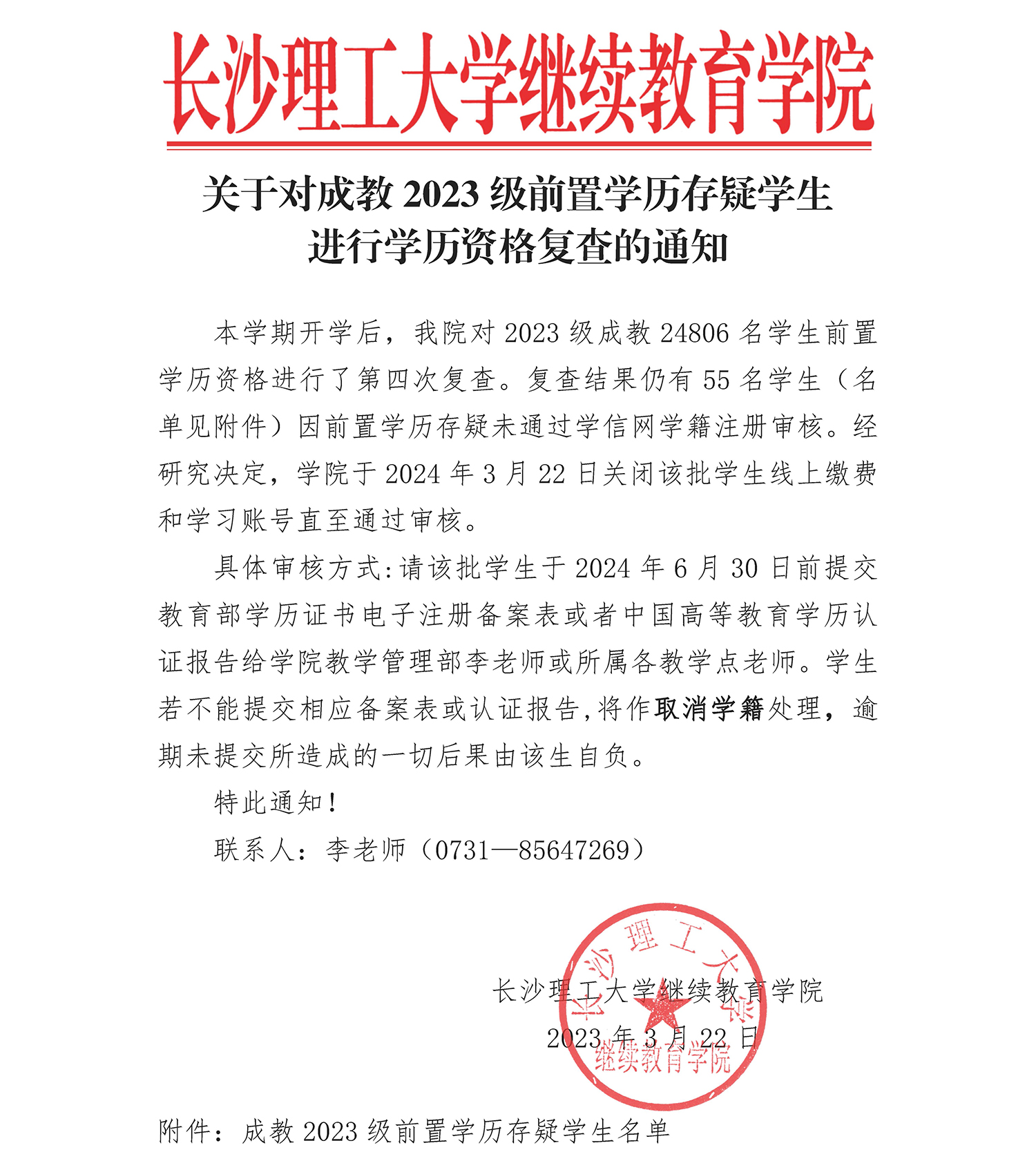 关于对成教2023级前置学历存疑学生进行学历资格复查的通知