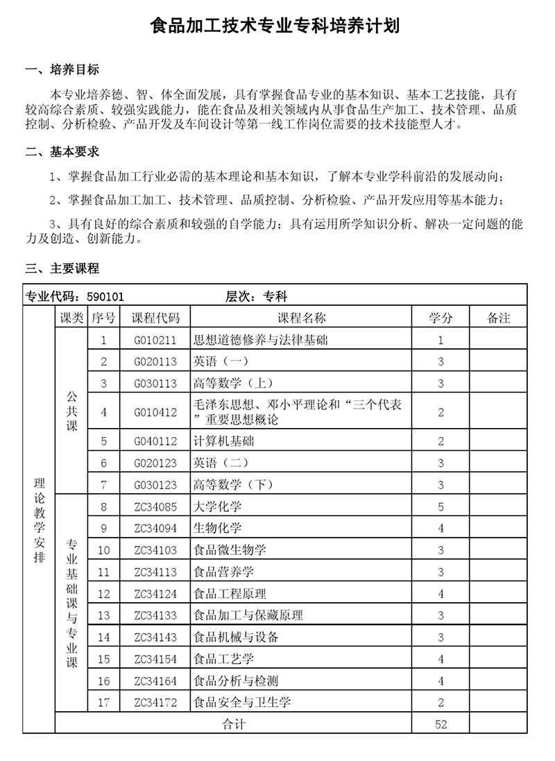 专科培养计划-专业代码:590101 食品加工技术专业