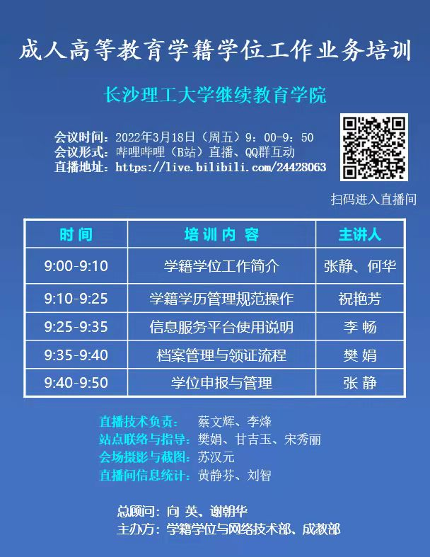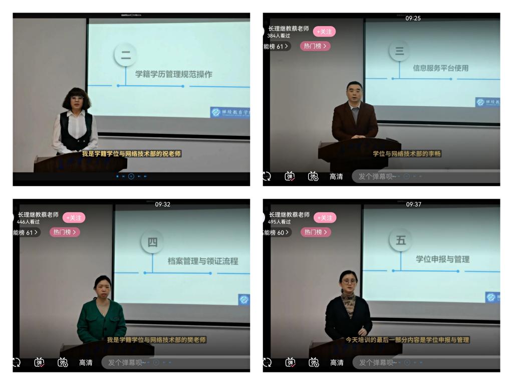 学籍学位管理事关学生的切身利益,是体现以学生为中心、保障人才培养质量、助力学生成长成才的重要工作。由于我院成人高等教育的学籍学位管理直接面向全国各地的函授站点,因此,本次培训旨在加强学院与函授站点间的沟通与交流,帮助站点更全面地了解学籍学位工作的相关政策要求和规范流程,保障工作质量,提高工作效率。主要授课内容为:学籍学历工作简介、学籍学历管理规范操作、信息服务平台使用、档案管理与毕业证领取流程、学位申报与管理等,授课形式采用线上直播。在学籍学位与网络技术部全体老师两个多月的精心筹备下,不到一个小时的线上培训,直播间观看人数达到500多人,培训效果得到了各函授站点的一致好评。参训人员纷纷点赞老师们的精彩讲授和精心准备,主动要求提供培训视频和资料,供会后反复观看学习。