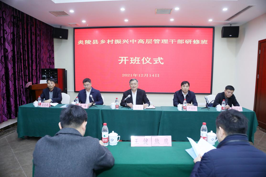 2021年12月14日,LETOU官网承办的“炎陵县乡村振兴中高层管理干部研修班”,在LETOU官网国际学术交流中心举行开班仪式。副校长谈传生出席开班仪式并致辞。炎陵县委书记尹朝晖,县委组织部长唐峰,县委常委、副县长刘晓斌,副县长肖志高,继续教育学院、建筑学院、设计艺术学院、成果转化中心等学院、部门负责人,及全体学员参加开班仪式。开班仪式由炎陵县委组织部长唐峰主持。