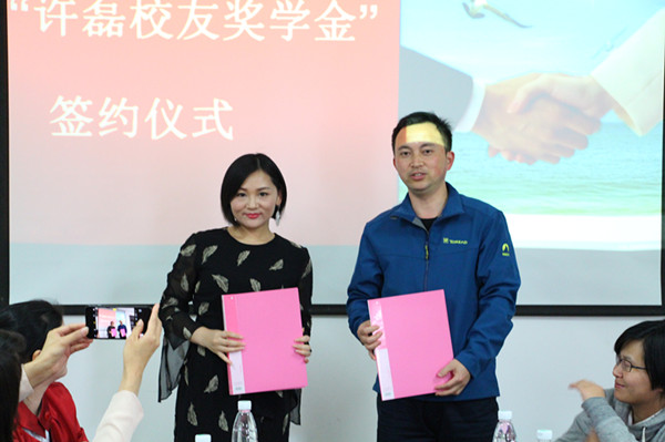 许磊校友表示文法学院的中文系办学历史悠久,有许多同学在此播种梦想、走向辉煌,这次捐资设立校友奖学金回馈母校是想开个头,让更多校友关注母校发展。同时校友奖学金的设立也是为了能够帮助到那些品学兼优的学弟学妹,这笔奖学金也是一种信念,希望他们能够带着这份信念在今后的人生道路上越走越远。最后,她还对在座的昔日恩师表示感谢,感谢老师们的教导之恩。