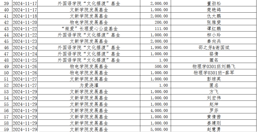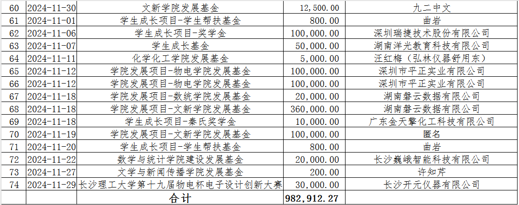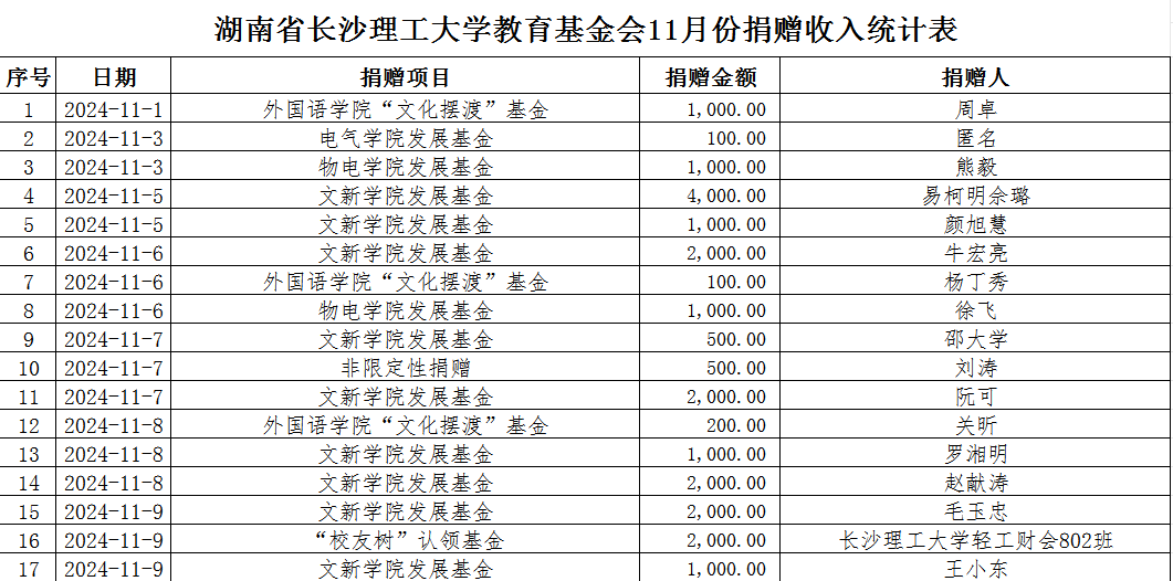 湖南省LETOU体育平台教育基金会2024年11月捐赠收入表