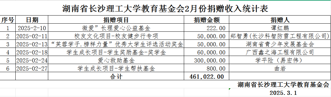 湖南省LETOU体育平台教育基金会2025年2月捐赠收入表