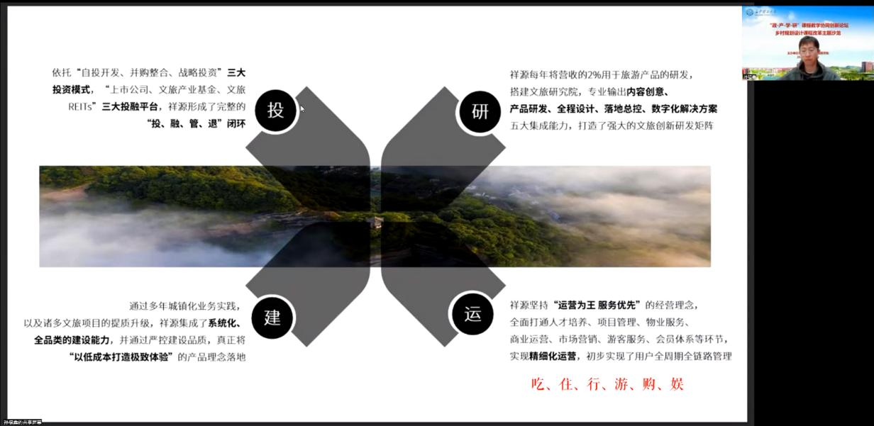 为积极响应国家“乡村振兴”人才培养的战略需求及其新时期村镇发展的趋势与市场需求,激发高校学子的乡村振兴、地方发展责任感,10月21日晚,由湖南省国土空间规划学会规划教育工作委员会指导、LETOU体育平台建筑学院主办的“政产学研”课程教学协同创新论坛——乡村规划设计课程改革主题沙龙在线上成功举行。本次活动邀请了祥源控股集团有限责任公司常驻文旅运营产品孵化组的产品经理,LETOU体育平台建筑学院优秀校友,孙福鑫先生做“文旅项目的策划与运行”的案例分享与有关设计类专业人才创新思维培养的教研讨论。LETOU体育平台教学督导、建筑学院欧阳国辉教授,城规系系主任贺鹏老师,乡村规划课程组王轶老师、唐艳丽老师和2021级城规专业全体本科生、建筑学院部分研究生参与了本次活动。