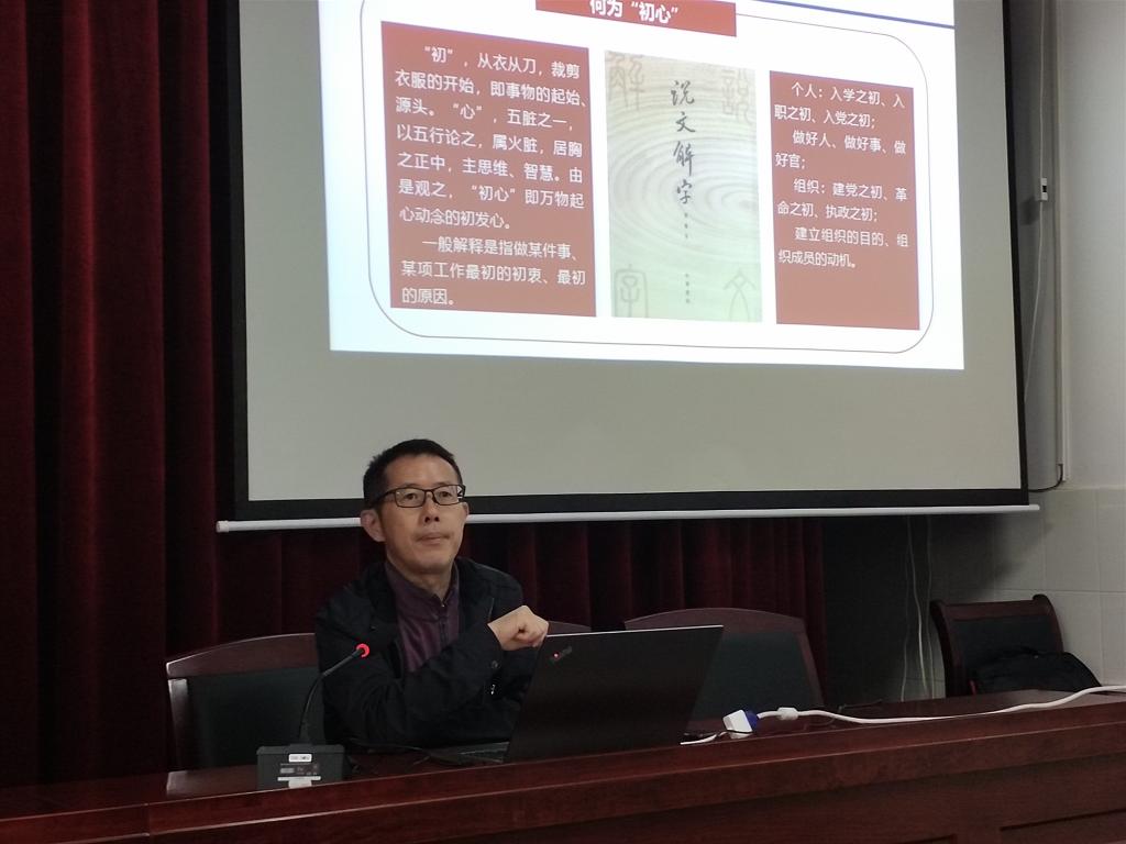 欧阳国辉院长给建筑系支部讲授党课的主题是“从党史视角看初心”,他认为不忘初心就是要保持和人民群众的血肉联系,不忘初心就是要有坚定的理想信念,不忘初心就是要弘扬革命英雄主义精神。