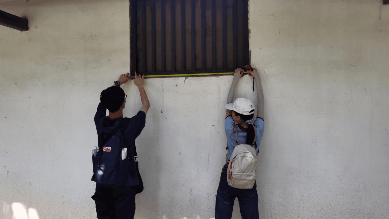 在调研测绘工作开始前,学院给大家分配了激光测距仪,未被分配激光测距仪的小组使用卷尺或是借助无人机等工具进行测绘。指导老师强调此次调研测绘主要是收集平面、立面、剖面这些数据并且拍摄建筑细部的照片以便于模型的制作。在工作中,小组成员互相帮助,集思广益,分工明确,在团队中发挥自己的作用,在调研中提升自己能力。在不破坏公共秩序和建筑本体的情况下,参赛选手对红色建筑各种数据作了详尽的调查。红墙黑瓦,断壁残垣,革命先辈的痕迹,红色精神的凝结,都给参赛选手留下了深刻印象。最后,参赛选手都收集好了数据,并安全到校。