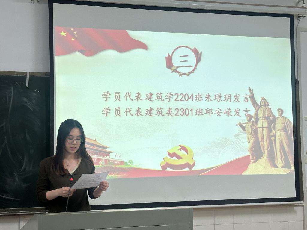 建筑学2204班朱璟玥和建筑类2301班邱安嵘分别作为发展对象和入党积极分子培训班学员代表进行发言。朱璟玥在发言中表示,她将从三个方面提升自己:一是争做理想远大、信念坚定的青年模范,积极向党组织靠拢,时刻以党员的高标准严格要求自己,深入学习党的创新理论,深刻领会党的创新思想;二是争做刻苦学习、锐意创新的青年模范,在实践中不断培养自己的创新精神与技能,提高综合素质;三是争做艰苦奋斗、无私奉献的青年模范,脚踏实地、求真务实,吃苦在前、享受在后。她呼吁同学们要勤于学习,敏于求知,在奉献、奋斗和创造中领悟青春的瑰丽,用坚定的信念撑起中华民族时代精神的脊梁。邱安嵘则在发言中表达了自己入党的决心,表示会珍惜学习机会,达到学有所思,学有所得,学有所成的目标,在学习过程中不断端正态度,遵守学习纪律,完成学习任务,将以饱满的热情和实际行动投入到党校培训中,加强自身修养,增强先进意识,早日实现加入党组织的梦想。
