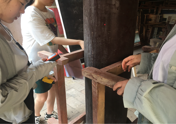 暑假“三下乡”的第二天,同学们进行数据复查复核,重新测量有出入的地方,对整体场地的周边环境大尺度数据补齐,对细部尺寸进行细化,并根据老师的指导和纠错继续测绘,有问题和出入的地方多次测量求取平均值,减小误差。对传统建筑特有的花纹进行绘制,加深对古建筑的理解,通过不断的补充优化,完善测绘工作结果。