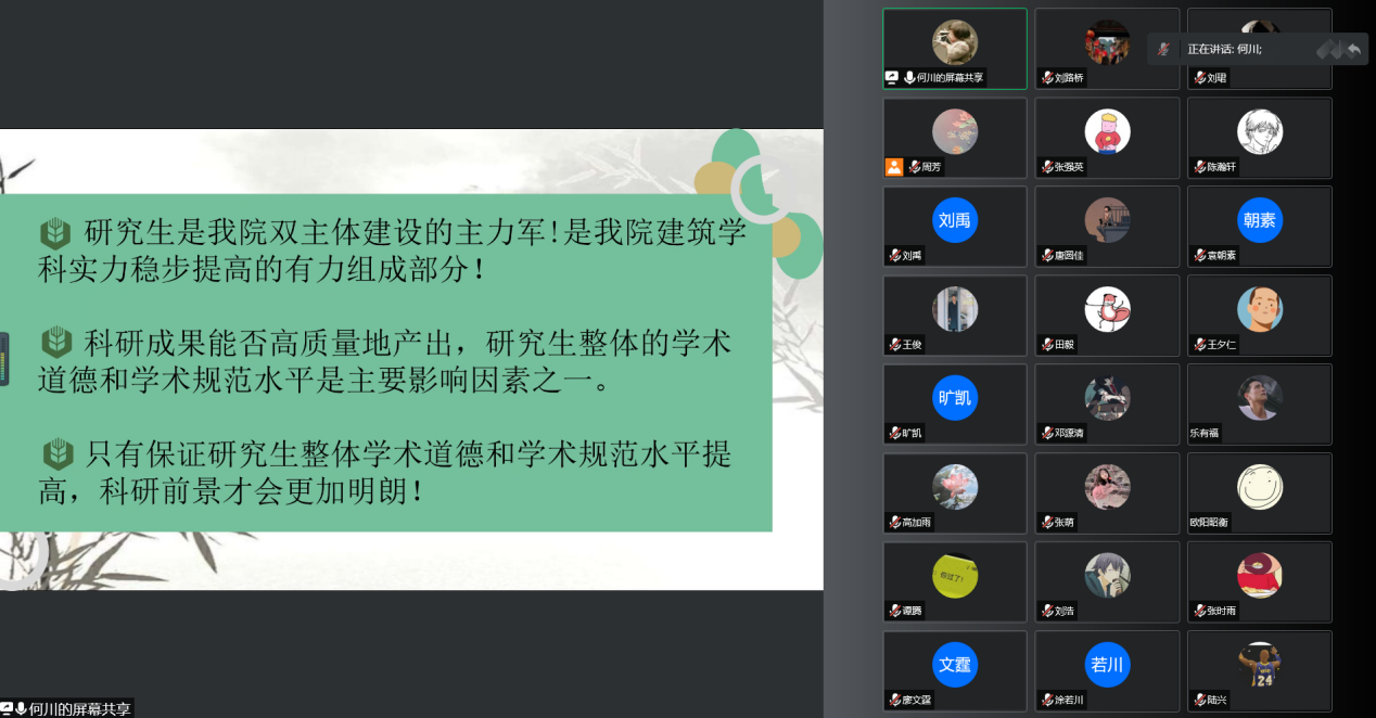 为营造良好学术道德氛围,引导研究生遵守学术规范、坚守学术诚信、有效预防学术不端行为。建筑学院副院长何川为22级研究生新生主讲学术道德与规范讲座,讲座于8月29日上午10: 00在线上进行,全体22级新生参会。